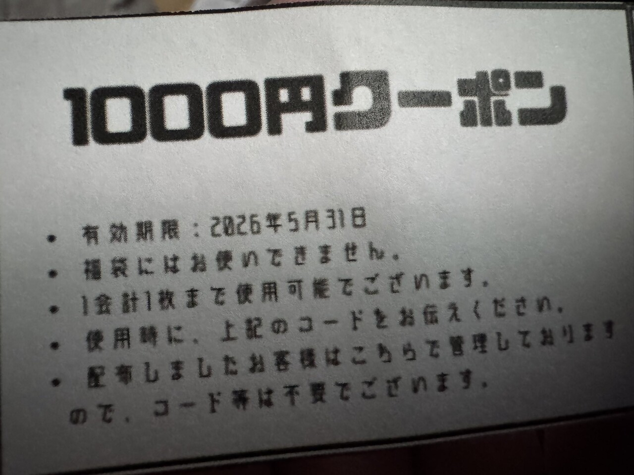 ▽1会計1枚しか使えない1000円クーポン期限が5月31日まで、、60000円分、、これは一線を超えた詐欺福袋かと思います。お体とお心ご自愛ください。